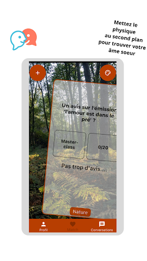 Créez votre profil en répondant à des questions sur votre personnalité, vos valeurs et vos passions. Pas de photos à ce stade.
